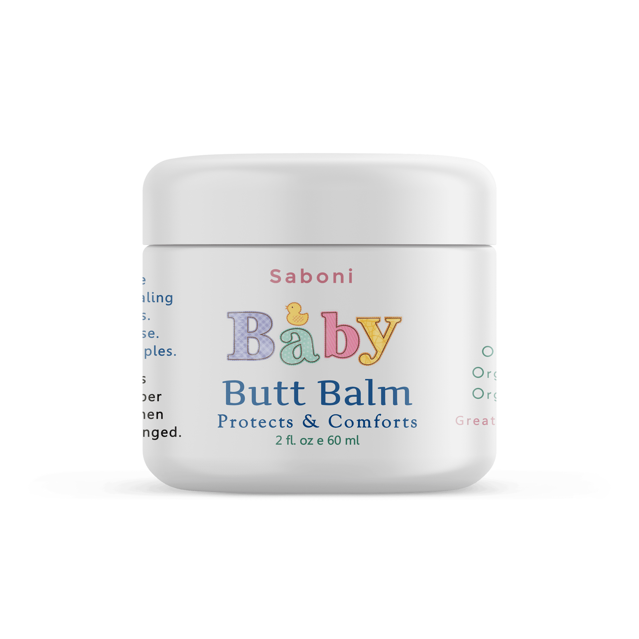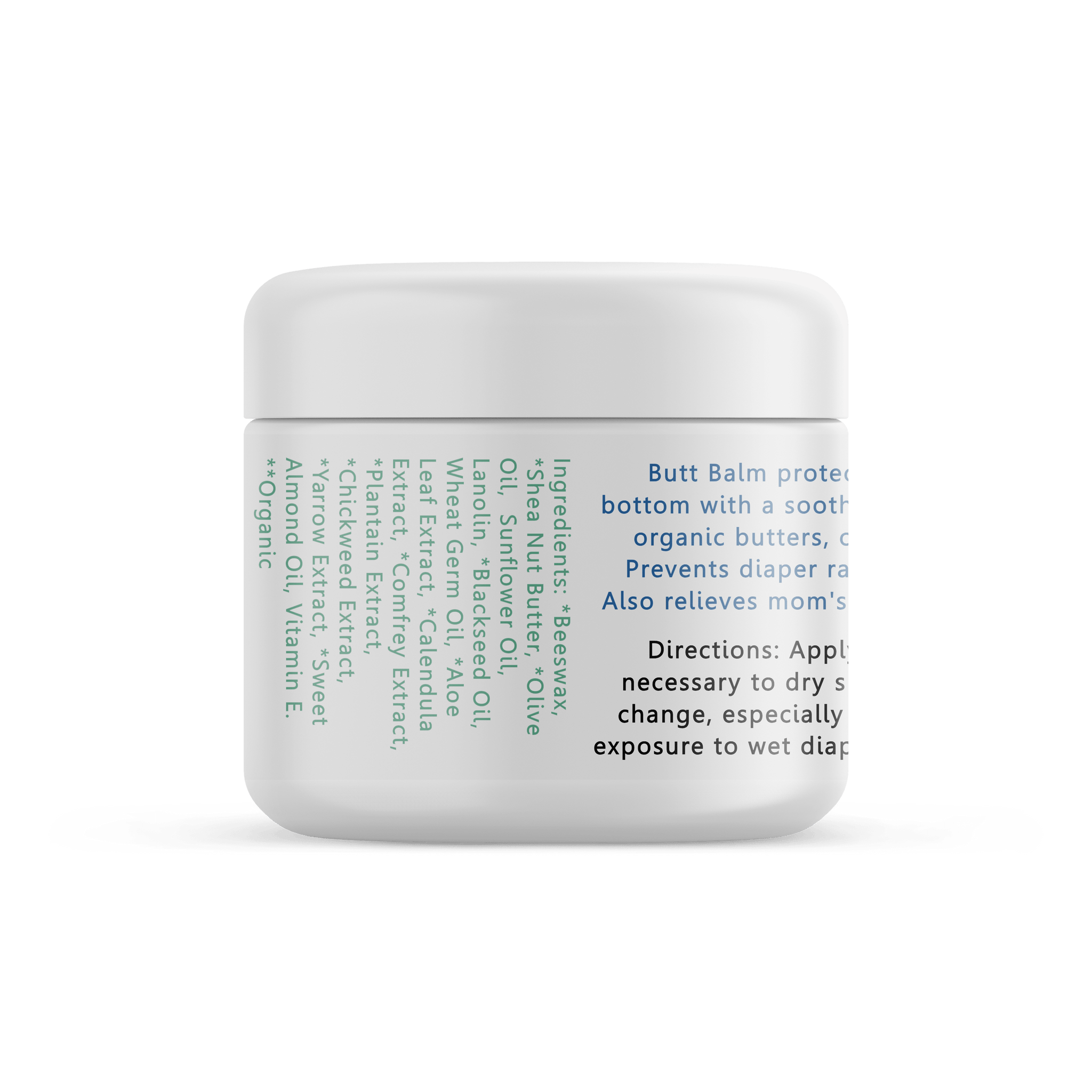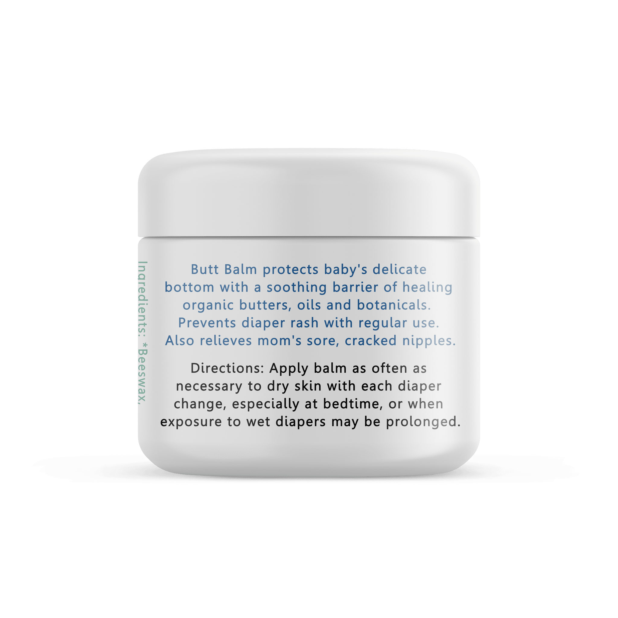 Our all natural Butt Balm forms a protective barrier that shields baby from wetness which can irritate delicate skin. It quickly provides relief, and soothes irritated skin. Natural anti-inflammatory, and skin conditioning ingredients start the healing right away. Effectively treats diaper rash, thrush, and relives sore, cracked nipples for breastfeeding moms.